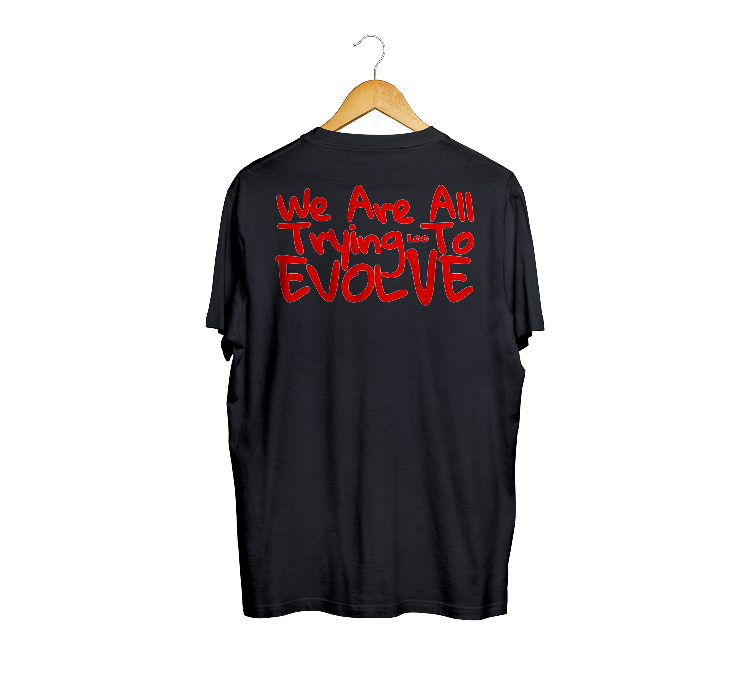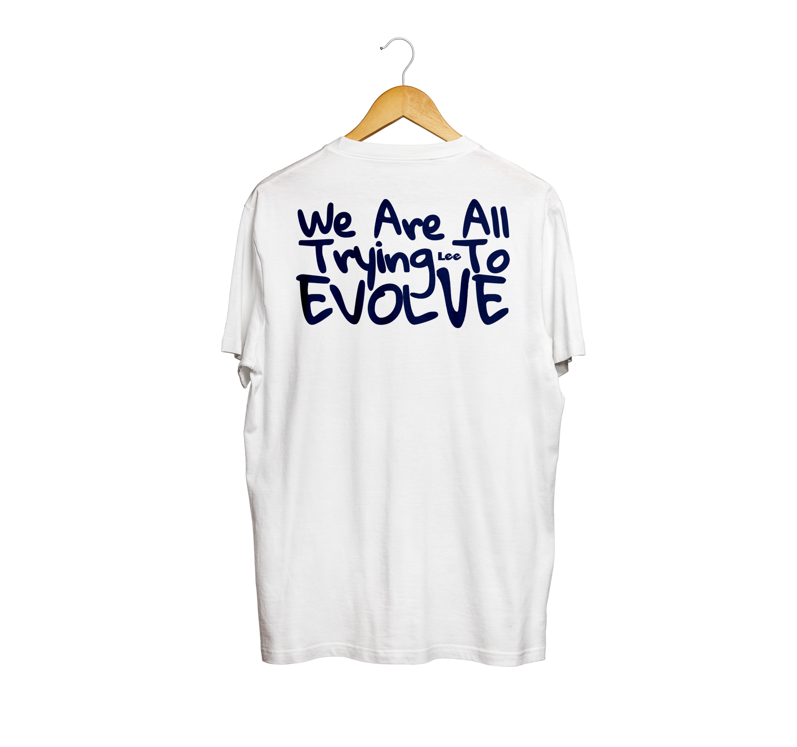 Handwritten script: “We are all trying to evolve” on the front and back.